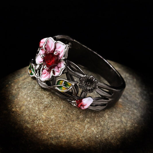 925 Stamp Jewelry Set for Women Fashion Flower Ring Necklace Earrings Creative Black Gold Three-Piece Set Wedding Bridal Jewelry